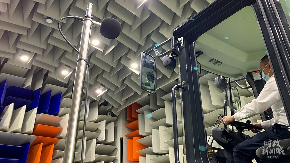 △研发中心的半消声实验室正在为一款纯电动装载机检测噪声数据。(总台央视记者程铖、张晓鹏拍摄)