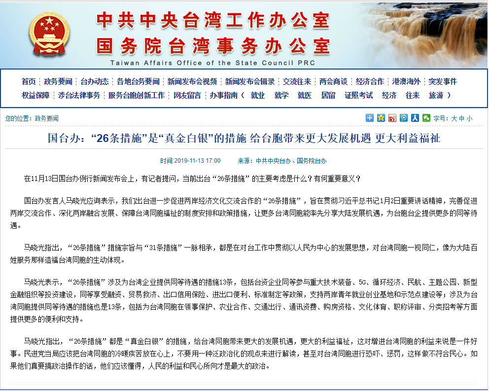 马晓光表示,“26条措施”涉及为台湾企业提供同等待遇的措施13条,包括台资企业同等参与重大技术装备、5G、循环经济、民航、主题公园、新型金融组织等投资建设,同等享受融资、贸易救济、出口信用保险、进出口便利、标准制定等政策,支持两岸青年就业创业基地和示范点建设等;涉及为台湾同胞提供同等待遇的措施也是13条,包括为台湾同胞在领事保护、农业合作、交通出行、通讯资费、购房资格、文化体育、职称评审、分类招考等方面提供更多的便利和支持。