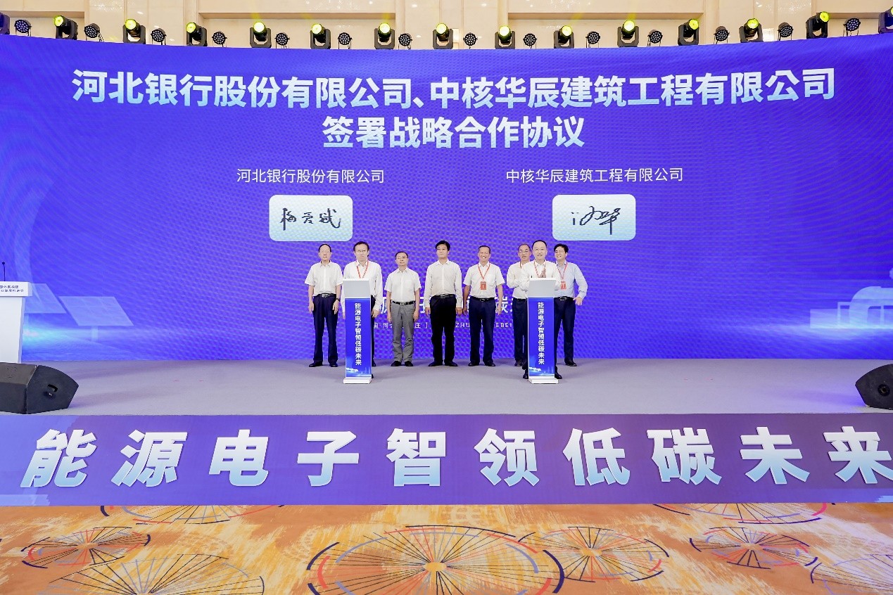会上,河北银行股份有限公司和中核华辰建筑工程有限公司就全面深化战略合作,践行绿色发展理念签署战略合作协议,双方以生态服务能力赋能产业高质量、可持续发展,以绿色金融和央企标准服务河北低碳转型发展。