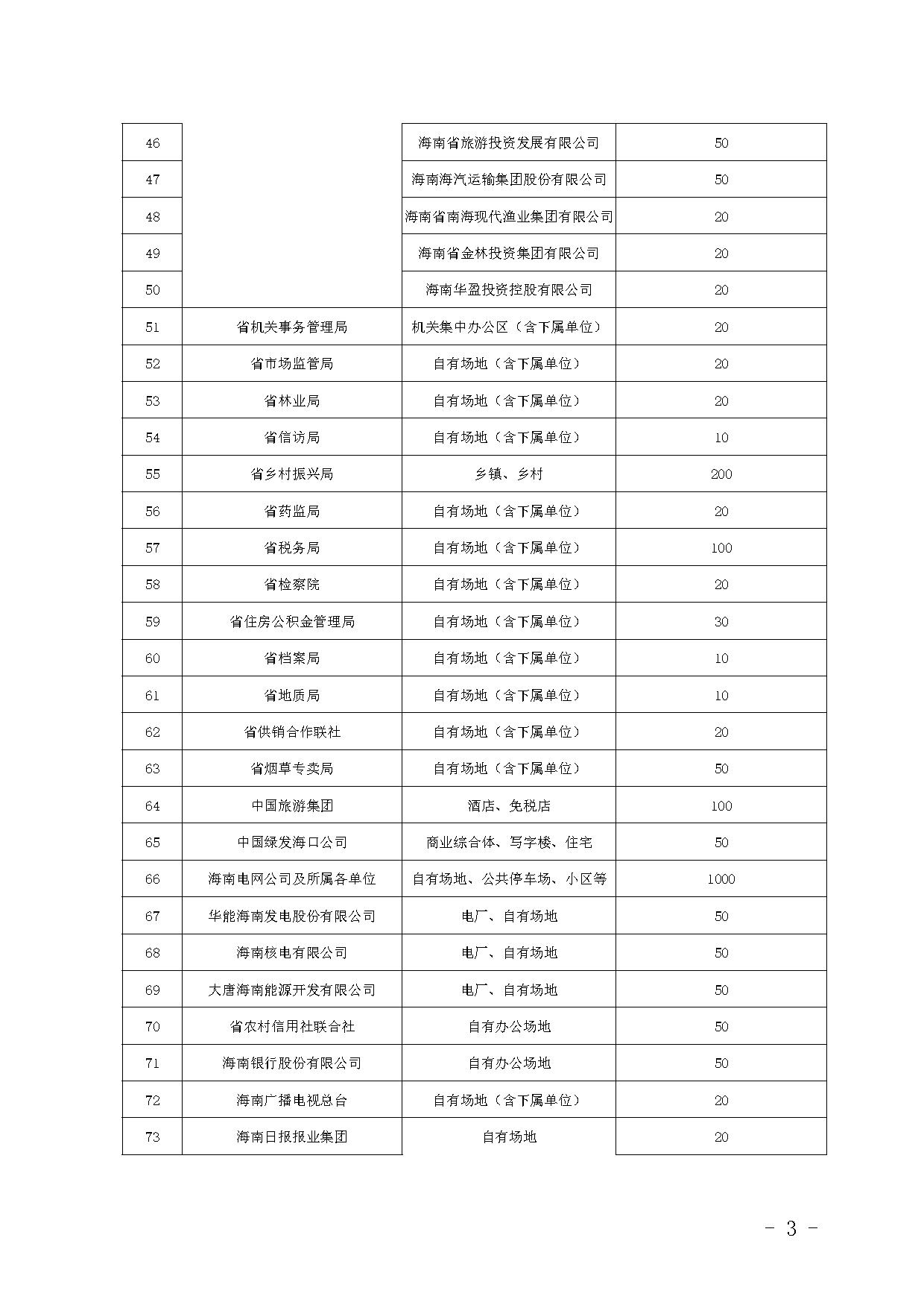 (六)公共经营场所建设任务。2022年,我省有30%的景区景点建设充电设施,其中5A级景区充电设施建设100%全覆盖、4A级景区充电设施建设覆盖60%。全省有50%文体场所建设充电桩。全省有10%规模以上宾馆酒店建设充电桩,其中海口、三亚、琼海、万宁、陵水等热门旅游市县规模以上宾馆酒店充电设施建设覆盖率不低于20%。全省70%二级以上医院建有充电桩。全省有70%以上大学和职业学校建有充电桩。
