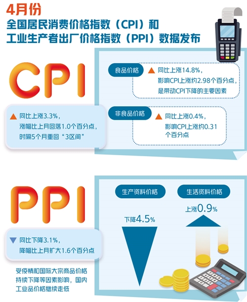 4月份,CPI同比上涨3.3%,比上个月回落1.0个百分点,时隔5个月重回“3区间”。随着国内新冠肺炎疫情防控向好的态势进一步巩固,生产生活秩序加快恢复,食品价格同比涨幅回落,带动了CPI的继续下降。专家认为,展望全年,猪肉等部分食品价格仍然是影响CPI走势的主要因素,CPI结构性特征依然明显,预计将呈“前高后低”态势。