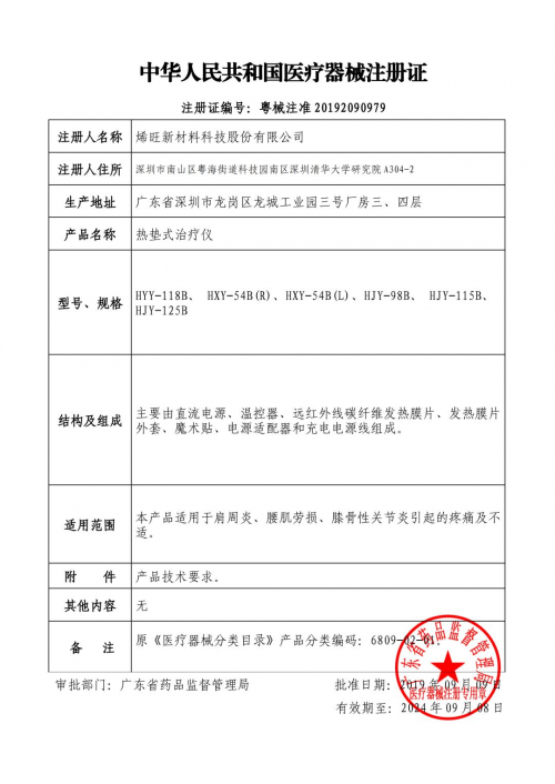 去年4月,烯旺科技在无锡召开的医疗战略研讨会上首次对外宣布石墨烯医疗和科研成果,包括数个医疗难题的攻克成果及最新石墨烯医疗产品。9月9日,凭借专业的医疗科研团队及强劲的产品研发实力,烯旺科技的医疗器械产品热垫式治疗仪正式获得中国医疗器械注册证书(编号:粤械注准20192090979),成为国内首家取得医疗资质石墨烯企业。