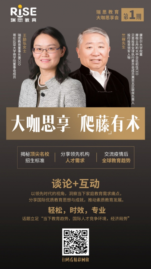 近期,瑞思英语推出了全新直播栏目“瑞思英语•大咖思享会”,并邀请贝恩投资全球执行委员会成员兼亚太区联席负责人、摩根士丹利大中华区前任CEO、康奈尔大学校董竺稼与瑞思英语CEO王励弘作为第一期嘉宾,分享了自身的藤校经历及对人才培养的独到见解,与观众们共话“爬藤”。
