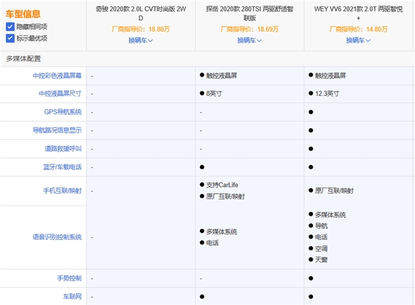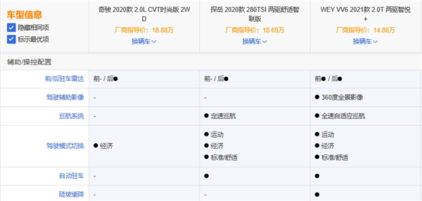 考虑到这一点,我把市场中口碑较不错的奇骏(2020款2.0L CVT时尚版 18.88万起)、探岳(2020款 两驱舒适智联版18.69万起)、WEY VV6(2021款2.0T 两驱智悦+ 14.80万起)拿来对比一番,大家可来围观一波。