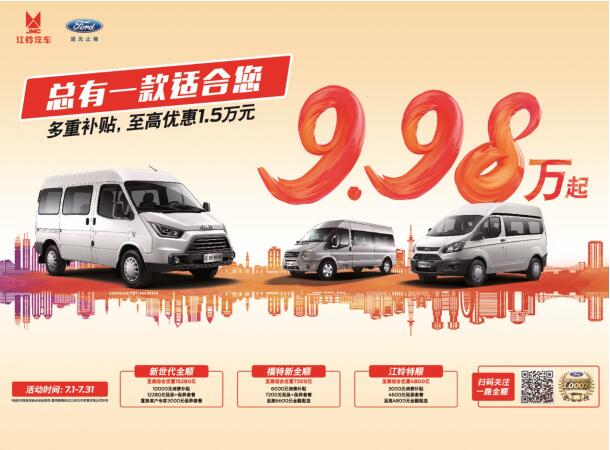 目前,购买江铃特顺,或是江铃福特轻客家族中的任何一款车型,均可享多重补贴,至高获得1.5万元的综合优惠,还有100万升机油、手机等更多售后夏日福利,等你来赢。而江浙沪的消费者购买江铃特顺,更可享受最高1万元现金优惠,山东河南的消费者购买江铃特顺,也可享最高7000元的现金优惠,超值专享助力用户事业一路开挂,财富翻番。
