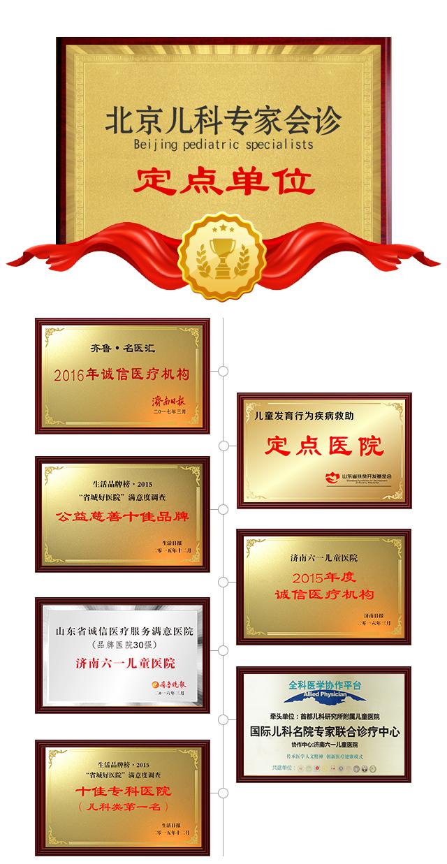 权威的专家团队奠定了济南六一儿童医院在治疗儿童疑难杂病方面的龙头地位。济南六一儿童医院汇聚儿科各领域知名专家大师,与国内外知名院校强强联合,在学术交流及医疗合作方面实现无缝衔接,并邀请中日友好医院儿科主任、首都医科大学博士生导师、北京大学医学部教授周忠蜀;首都医科大学附属北京宣武医院周小凤教授;首都医科大学附属北京儿童医院神经科专家张纪水博士;清华大学附属二院儿科主任张英教授;火箭军总医院聂亚玲主任等知名儿科专家定期来医院进行会诊,为患者提供全方位、高品质、精益化的诊疗、保健与康复服务。