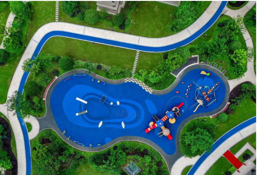 地面尽量做到平顺处理,减少地面连接处的缝隙,在缝隙处以合适材料填充,避免孩子在社区内骑自行车、玩滑板时的意外跌倒、摔伤。