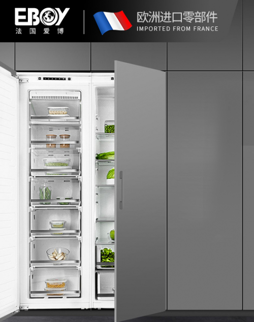 这款EBoy爱博DR1&DR2组合对开门嵌入式冰箱采用双驱双风无霜系统,可维持实物均匀干湿度,而且采用变频压缩机,能耗等级可以达到欧盟A++等级,真正做到花小钱,办大事。并且它配备了内置智能化电脑芯片,能在降低能耗的同时依然大大的保证了食物在冰箱里的新鲜度。值得一提的是它的静音也做得特别完美,最低可以降至42分贝,让你感觉在图书馆里一样的安静,更别提它那些人性化的设计,在不损失冷藏空间的前提下,增加了两个超大的滑轨式双果蔬盒,既封闭又保鲜。
