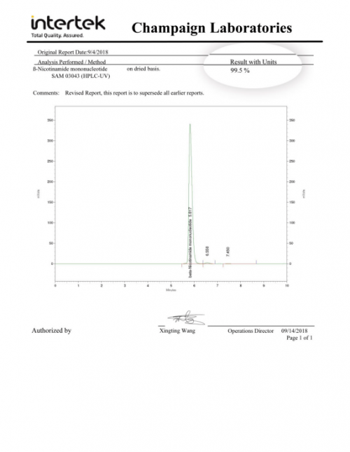 杉宝NMN第三方检测报告显示β-烟酰胺单核苷酸(NMN)纯度高达99.5%
