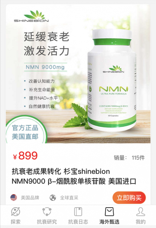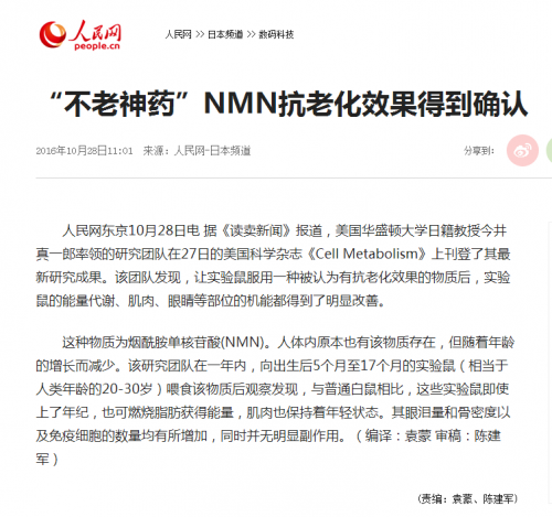 2019年10月,人民网曾发表过题为“‘不老神药’NMN抗老化效果得到确认”的报道,称美国华盛顿大学在实验中给实验小鼠喂食了NMN,随后实验鼠器官机能得到了显著改善。