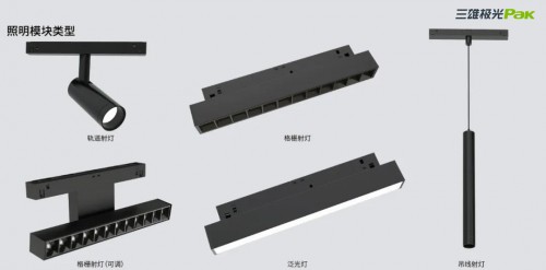 目前灵动系列具有泛光模块、格栅模板、射灯模块、吊灯模块4种不同类型照明模块,可根据需求自由组合搭配。这意味着,无论是用于突出建筑元素的重点照明,还是提供基础照度的整体照明,或是增强空间情感的氛围照明,都可以用一组磁吸轨道系统灯具满足。
