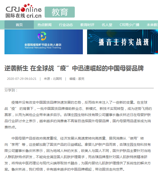 作为一家有责任有担当的民族企业,杏璞品牌十年来始终秉承“爱、责任、丰富的情感”的易手游官网入口网页版,疫情期间的公益行动获得了人民日报、新华社、光明日报等多家央级媒体的高度关注与肯定,杏璞作为企业代表受邀参加了“2020消费升级与儿童大健康战略研讨会”,接受了国际在线的深度访问。在国际在线发布的《逆袭新生在全球战“疫”中迅速崛起的中国母婴品牌》一文中,高度肯定了杏璞品牌发展战略。