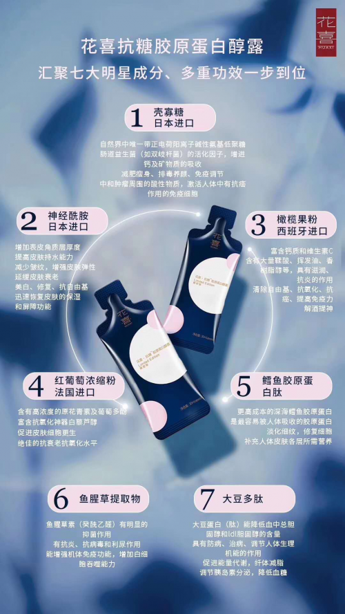 花喜抗糖胶原蛋白醇露采用了日本进口壳寡糖、深海鳕鱼皮胶原蛋白肽、西班牙进口橄榄果粉、法国进口白藜芦醇、神经酰胺等等成分。不一样的高端成分,赋予了它不一样的功效。花喜抗糖胶原蛋白醇露是目前国内唯一的一款集合了抗糖化+美白+抗氧化+保护血管四位一体的产品。