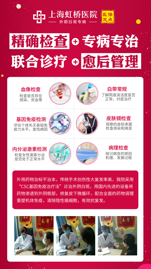 上海虹桥医院一直致力于“精检查·专治疗·抗复发”规范化治疗外阴白斑疾病,组建京沪专业外阴白斑专家团,专研多项先进诊疗技术,帮助广大女性患者早日摆脱外阴白斑困扰,轻松止痒祛斑防复发!