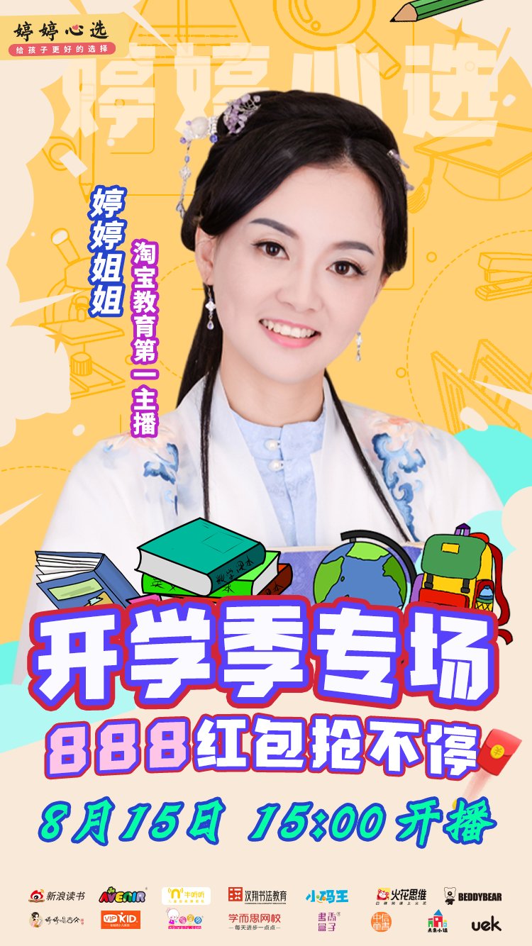 8月15日,“婷婷心选”将继续以沉浸式直播的形式,在淘宝平台开启一场长达6小时的开学季直播盛宴。届时,新浪读书、汉翔书法教育、VIPKID,火花思维、小码王、学而思网校、婷婷唱古文、中信出版社、海豚出版社·歪歪兔、书香盒子、牛听听、德国avenir、杯具熊等十多家知名儿童教育品牌将与“婷婷心选”一起联动,为孩子们的开学季做足准备。