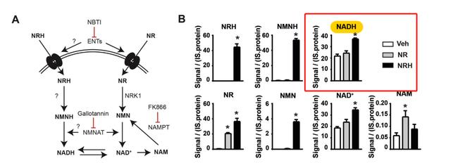 上图是通过给细胞添加NADH一小时后,细胞内NADH(A)和NAD+(B)的浓度变化。可以发现所有NADH浓度都增加了细胞内NAD+水平,但低浓度补充NADH时细胞内NADH水平变化不明显。