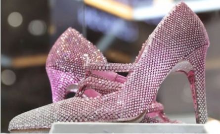 2018年在进博会亮相的肯辛顿公园瑰宝系列春灿高跟鞋,一共用了600克的18K金,4颗主石各1克拉,还有一万颗共计300克拉的粉红钻石,宝石都从印度挑选而来,而且都经过国际鉴定机构IGI与GIA双重认证。