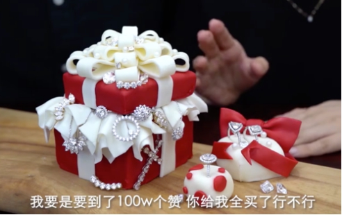 视频中整个蛋糕镶嵌了价值189万的培育钻石16款钻石产品让人看的琳琅满目,仿佛隔屏就能闻到蛋糕的香味。作为资深美食博主的小麟和小王夫妇最近才“持证上岗”,为了庆祝50万粉丝福利小麟承诺视频要有百万点赞就给小王买下这堆首饰,目前离兑现承诺也不远了。