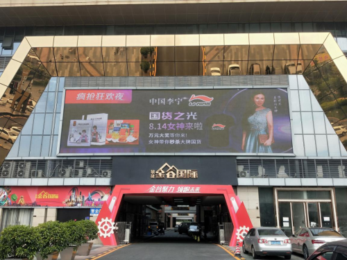 敏捷金谷国际园区户外几处大屏幕24小时滚动宣传着腾讯直播红人榜头部主播“互联网女神”陈建英挺精品国货的直播预告。
