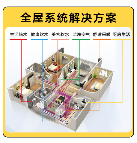 A.O.史密斯提供的一站式上门设计服务-- 全屋系统解决方案,包含六大集成系统:生活热水、健康饮水、美容软水、洁净空气、舒适采暖、厨房生活。全面提升装修家居体验,实现舒适、健康、节能。