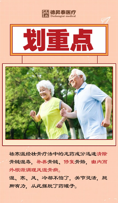 第一个阶段,快速止痛。德昇泰医疗颈椎病调理秘方——祛寒温经壮骨疗法的膏汁吸收快,有效成分,随着血液的运行,很快到达炎症部位,缓解疼痛肿胀,清除积液。患颈椎病的朋友服用当天疼痛就减轻,三天就会感觉骨关节发热,筋骨舒畅。服用一个疗程,酸麻肿胀彻底消失,不怕冷。敷贴德昇泰医疗特质的膏贴上5分钟:骨缝都热乎乎,从头到脚都舒服;贴上10分钟:寒气逼出来,刺痛酸麻立刻消。内外同调,双管齐下,效果加倍。