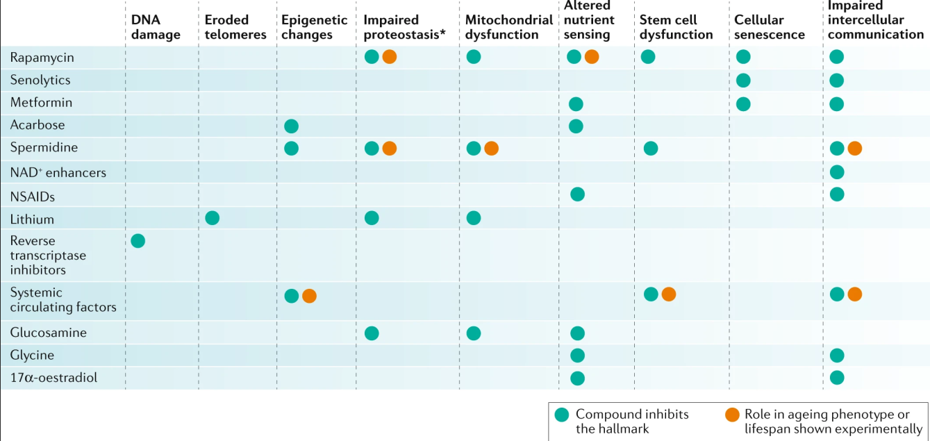 目前已经有几百种潜在抗衰老手段的研发获得发布,这一综述通过在动物模型中延长动物寿命、缓解衰老的人类生物标志物、在不同种类的哺乳动物中的实验结果得到重复等标准,对这些潜在手段进行了分析,罗列出开发进度最快、最接近临床检测、或者具有独特机制的几项抗衰老手段,并将其分为两层,其中顶层包括雷帕霉素、senolytics、二甲双胍、阿卡波糖、亚精胺、NAD +增强剂和锂。