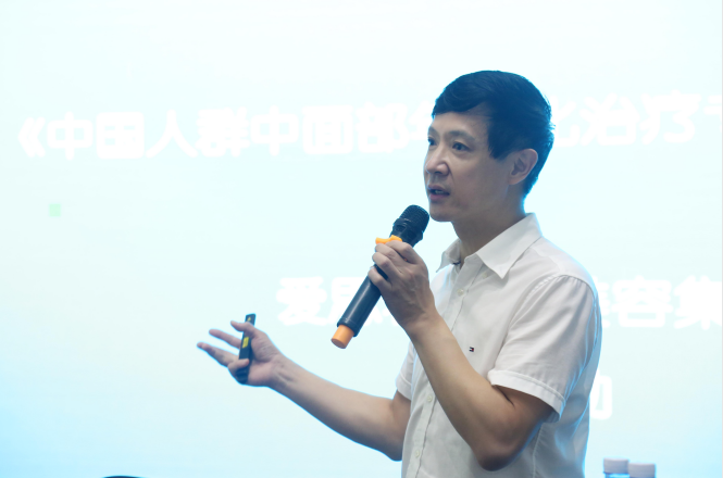 上午九时,李勤教授在一楼会议厅作了《中国人群中面部年轻化治疗专家共识》的学术解读,分别从“中面部老化特征:软组织与骨骼老化、透明质酸注射用与中面部年轻化治疗、中面部美容注射位点选择、肉毒素和胶原蛋白注射面部年轻化治疗”等系列技术课题分享。