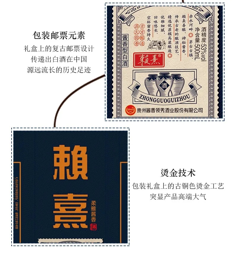赖熹柔雅酱香型白酒以赤水河河水为魂,以当地糯高粱为骨,居中国酒都茅台镇15平方公里核心产区内,通过古法酿造工艺与现代科技相结合,历经两次投料、九次蒸煮、八次发酵、七次取酒,精心酿造出传世美酒。
