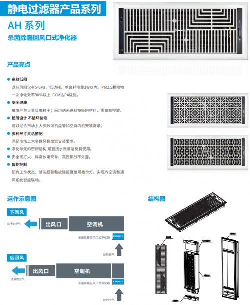 杀菌除霾回风口式净化器,石墨烯静电技术,及第二代微静电技术,采用开放式与封闭式电场技术、多极叠加加速电场技术电压均恒技术、光晕叠加技术(二代微电技术)使空气中的颗粒物带电荷,最终瞬间被吸附在集成模块上,达到高效净化污染空气的目的。可安装在风机盘管回风管道、回风口处。