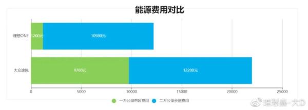 理想ONE总计三万公里能源费用12180元,大众途锐总计三万公里能源费用21960元。