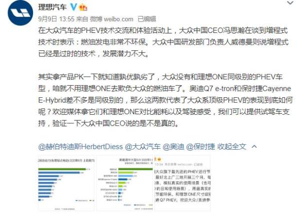 对此,理想汽车在官方微博上喊话:“其实拿产品PK一下就知道孰优孰劣了,大众没有和理想ONE同级别的PHEV车型,咱就不用理想ONE去欺负大众的燃油车了。奥迪Q7 e-tron和保时捷Cayenne E-Hybrid差不多是同级别的,那么这两款代表了大众系顶级PHEV的表现到底如何呢?欢迎媒体拿它们和理想ONE对比能耗以及驾驶感受,我们可以提供试驾车支持,验证一下大众中国CEO说的是不是真的。”
