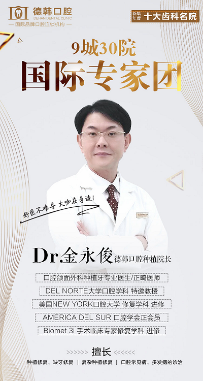 德韩口腔种植院长金永俊他曾任韩国百仕口腔种植院长一职,是口腔颌面外科种植牙专业医生、正畸医师,AMERICA DEL SUR口腔学会正会员、Biomet 3i国际种植牙学会正会员、智利SAN NICOLAS口腔医院外科科长、巴拉圭韩人口腔医院代表院长。