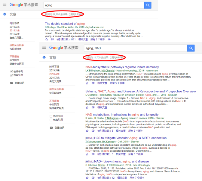 如果要说近几年抗衰老研究领域最火的“明星” ,NAD+肯定是当仁不让。NAD+又叫辅酶1,它在人体内非常重要,存在于每一个细胞中,参与上千项反应,能激活长寿蛋白Sirtuins。随手谷歌学术一下就能发现,NAD+在抗衰老领域的研究成果居然占到了抗衰老领域研究总成果的25%!也就是说每4篇讲到抗衰老研究的文章就有1篇是关于NAD+的。