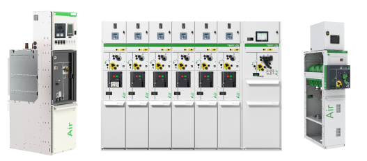 环保型中压开关柜GM AirSeT(左)、中压环网柜RM AirSeT(中)和SM AirSeT(右)
