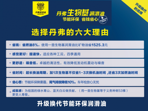 目前,中国市场上发动机油品牌众多,主要分矿物油和生物基油两大类。相比矿物质油,生物基油完美契合时代发展,不仅是润滑油的天命之选,更有潜力开创生物基的新纪元,这也是丹弗生物基润滑油天生的骄傲。