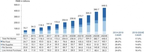 根据弗若斯特沙利文的数据,中国宠物行业的市场规模从2014年的人民币(单位,下同)707亿元增至2019年的2049亿元,并有望持续增长,到2024年将达到4495亿元,从2019年到2024年的复合年增长率约为17.0%,展现出宠物市场巨大的发展空间。