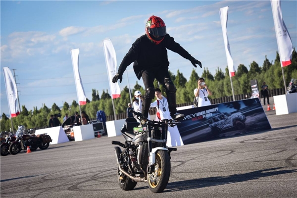 因此,在坦克300的开放日上,机车美女、硬汉骑士齐聚,由众多车友组成的机车队伍,特意从北京赶来助阵,并且还有专业机车选手现场炫技:“对向翘头”、“双车漂移”、“前轮滑”、“单飞燕”等一系列行云流水的机车特技表演,属实让我眼花缭乱、跃跃欲试。