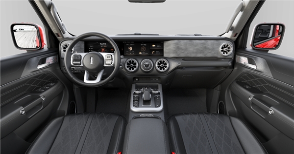 首先从内饰曝光图我们可以发现,坦克300的内饰同样秉承了方圆设计。方正的中控台、后视镜,继承了硬派越野车型一贯的“硬朗”、“粗犷”风格,再辅以圆形的“炮筒”式出风口、三幅式方向盘,使得整体内饰更加立体,质感十足。并且在细节之处,坦克300同样精细,车内采用大面积直轮廓线条搭配圆型空调出风口及方菱形缝线内饰板,与外观“方圆”设计遥相呼应。