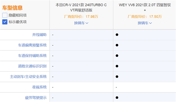 由于此番是带着家人一同前往,所以随行物品甚多,经过与妻子的商议后,我俩一致决定,将自家那台老旧的座驾换掉,入手一辆新的自驾“伙伴”。而在经过对市场的深入调研后,我将目光放在了两位家用SUV明星选手身上,分别是本田CR-V(2021款 240TURBO CVT两驱舒适版,厂商指导价:17.98万元)、WEY VV6(2021款 2.0T 四驱智驭+,厂商指导价:17.50万元)。同为20万级家用SUV车型,究竟谁能更胜一筹?莫慌,我们还得通过对比分析一波。