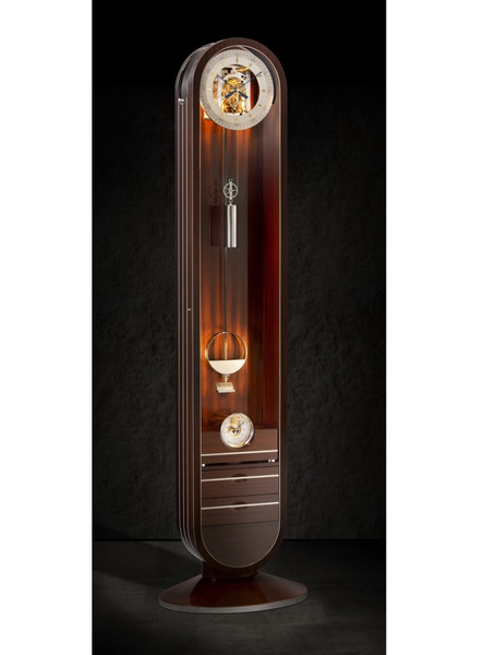 这款钟的机芯由顶部拱形穿透玻璃及带传感器控制的LED灯照明,这样全透明的设计在机械钟领域还是首创。此外,我们还特别使落地钟的桃花心木钟身平稳浮在子弹头形木座上,以此来勾勒一种新时代的科技感。同时,附带的可移动陀飞轮壁炉钟也顺应了如今的全球合作潮流,为使用者提供便捷的第二时区信息。金属条镶嵌,钢琴烤漆表面处理,一月超长走时,高精度机芯,碳纤温度补偿钟摆,使“Riva”成为一台艺术与尖端科技的完美结晶。