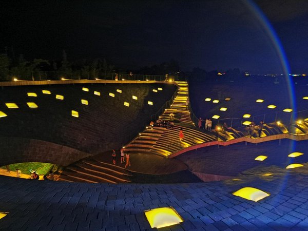 剧院建筑概念源于“水印苍山”,建筑轻柔漂浮的屋顶宛若苍山映于洱海的倒影,呼应着周围连绵的地形。露天广场与剧场“盒子”之间探索了一种建筑与景观地形一体化的空间对话,实现了广场到半室外表演空间的自然转化。