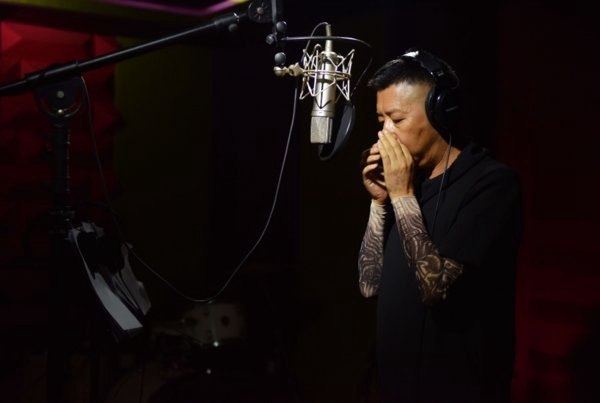 彝族知名歌手吉克曲布在录音室吹奏口弦