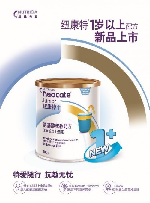 因为宝宝在发育过程中,对营养需求会有所变化,1岁以前的敏宝更需要DHA和AA来促进大脑及视力的发育,而1岁以后的敏宝对能量需求更高,纽康特1+就能满足这个需求。它是首款在中国官方上市的,从营养需求出发,专为1岁以上食物过敏宝宝定制的氨基酸配方粉。
