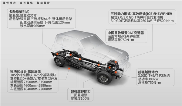 首先在动力总成方面,“坦克·WEY”平台,涵盖ICE、PHEV、HEV三种动力形式,主要有2.0/3.0 GDIT发动机,配合涵盖常规、P2两种形式的中国首款纵置9AT变速器,最优配置下,车型系统总功率/总扭矩可达到了380kW/750N·m,堪称同级最优越野动力。