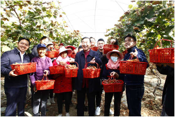 随后小分队来到敦厚村的葡萄种植大棚,丰收果实、高挂枝头,志愿者与种植农户一起采摘葡萄,共话乡村振兴、扶贫攻坚、增产增收,葡萄大棚中满是喜悦的笑声。