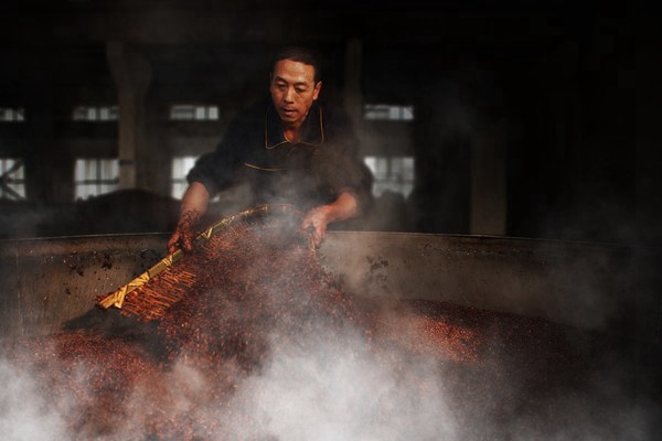 事实上,重阳下沙是一项秉承了千百年的酱酒生产工艺。贵州一带出产的糯红高粱颗粒小、饱满,呈酱红色,巧合的是,这与赤水河河沙的颜色十分相似,所以当地人都称其为“沙”。重阳时,用沸水与“沙”充分拌匀,让“沙”吃水,使“沙”上甑蒸时,能够较容易熟透,这便是“润沙”。在进行“润沙”时,还要按照一定比例投入、搅拌曲母,当水分、曲母达到酿酒要求,就把“沙”堆积成一个小山包,进行堆积糖化。实现二次制曲、进入厌氧发酵池。至此,从操作程序的层面而言,重阳下沙就初告完成。
