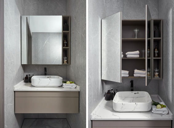 在柏厨眼中,小空间绝不是借口,而是一种挑战,不同的家庭结构、不同的户型条件自然就有着不一样的设计需求,如何最大化的提升空间利用率,平衡美学精神和实用性能的比例就成为柏厨浴室柜设计的突破点之一。柏厨家居云涧,是充分还原了东方文化气韵的新中式设计,在细窄型空间内,借力两侧墙壁,将浴室柜嵌入其中,下层远离地面,阻隔地面水对柜体的侵蚀,收纳柜被掩于玻璃镜之后,那些细细碎碎的生活小物品被收纳在这里,使用时轻轻推开仿古推窗式门镜,即刻取拿。简素的色彩搭配,既衬托了浴室空间的一尘不染,也削弱了空间的局促感,更是高级审美的最佳体现。