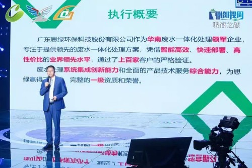 中国创新创业大赛作为一项国家级的创新创业赛事,是全国范围内历史最久、规格最高、参与最广的创新创业赛事。本次大赛采用8+2的比赛形式,8分钟PPT展示加2分钟评委专家提问。在8分钟PPT展示阶段,思绿环保总经理廖勇强从公司概况、团队情况、行业分析、技术与产品、商业模式五个方面详细地展示了思绿环保的成长经历。思绿环保非常重视发挥产学研优势,和高校、科研院所联合开发先进处理技术,具有多项发明专利、高新技术产品、软件著作权等,并重视商标和知识产权的保护,通过了企业知识产权管理体系认证,被评为广州市科技创新小巨人企业、高新技术企业等。