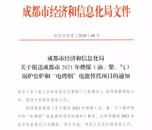 目前,成都市2021年燃煤(油、柴、气)锅炉窑炉和“电烤烟”电能替代项目正在申报过程中,各区(市)县可于2020年11月5日前将符合电能替代申报项目名单及验证材料正式报送成都市经信局,逾期将不再受理。