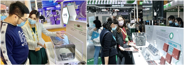 而一系列活用富士胶片核心技术的高新技术“种子”如MEMS技术、MR流体、蓄热胶囊技术及VCSEL也精彩亮相,借助进博会平台,就技术在中国落地开花的机遇和前景与观众做了充分的沟通交流。5G手机背盖用装饰膜、构造色INKJET技术、KV油墨等CMF材料也绚丽登场,被观众评为“未来智能硬件的颜值担当”,适用于各种表面及材质的装饰需求。据富士胶片(中国)创新中心所长徐瑞馥女士介绍,众多设备制造商和消费者对CMF材料非常感兴趣,某知名车企前瞻性开发人员也在现场就未来车内装饰的应用开发进行了洽谈,有望后续继续开展研究和探讨。